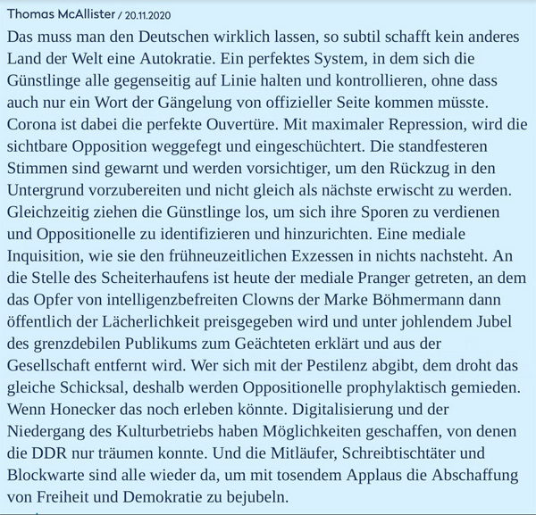 Aufgabe der Medien wäre es, Zahlen einzuordnen und über Vergleichsgrößen zu berichten. Doch sie tun es – mit voller Absicht – nicht. Folge ist, dass es dem unbedarften Angstbürger als nie dagewesene Horror erscheinen muss, wenn es in manchen Kliniken zu Kapazitätsengpässen kommt – obwohl dies schon immer der Fall war, ohne dass sich dafür je irgendein Journalist interessiert hatte. Und so ist auch eine massiv stärkere Belegung der Intensivstationen in der Grippesaison (an deren Stelle dieses Jahr ersatzlos Corona trat) im Winter gegenüber dem Frühjahr der absolute Normalfall – inklusive den damit einhergehenden Belastungsspitzen fürs Klinikpersonal. (Journalistenwatch, 15 Dec. 2020)
